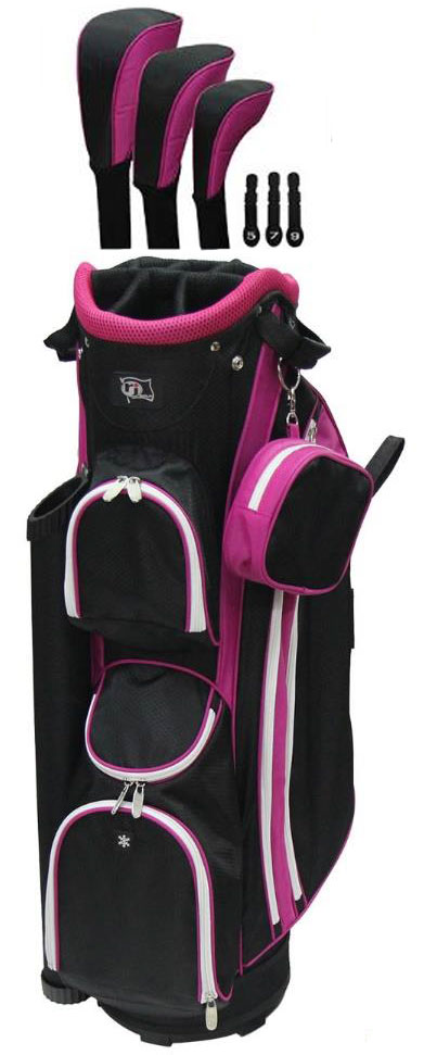 The new 2017 line of women's designer golf bags from RJ Sports are arriving next week and they are now available for pre-order! RJ Sports has been a favorite brand among our women golfers and we're excited about this new lineup! They redesigned one of their most popular golf bags to maximize features, but trim off some of the weight. I don't know how they did it, but this bag now weighs only 4.7 lbs and still has all the features you know and love in a golf bag. It's hard to find a good quality cart bag under 5 lbs, so we think our customers will really like this new feature. Plus, the LB-960 comes with a set of 3 matching headcovers included in the price. This bag is available in 5 eye-catching, yet classic colors and patterns, so you're sure to find one you love. Pre-order your new golf bag now!